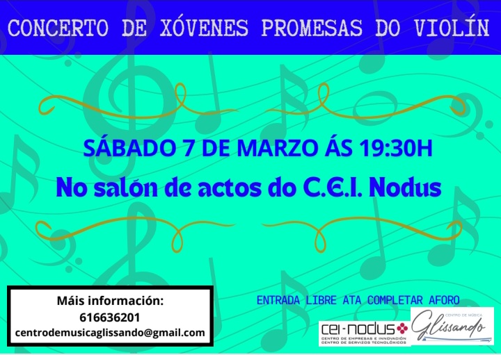 "Dentro das actividades programadas para o mes de marzo no Centro de Música Glissando, comezamos o sábado día 7 de marzo ás 19:30h co concerto que leva por título “ Xovenes promesas do violín” donde nenas e nenos con idades comprendidas entre os 5 e os 11 anos faran un pequeno percorrido polo repertorio do violín acompañados polo piano. Durante […]
