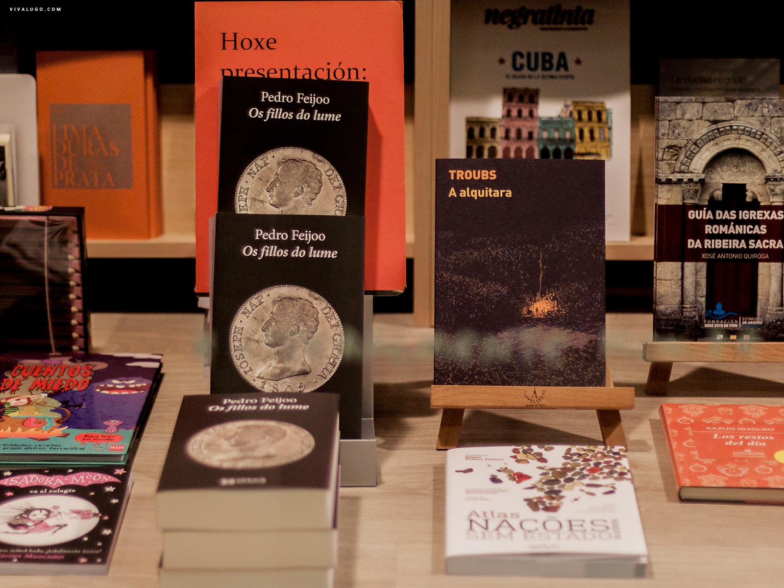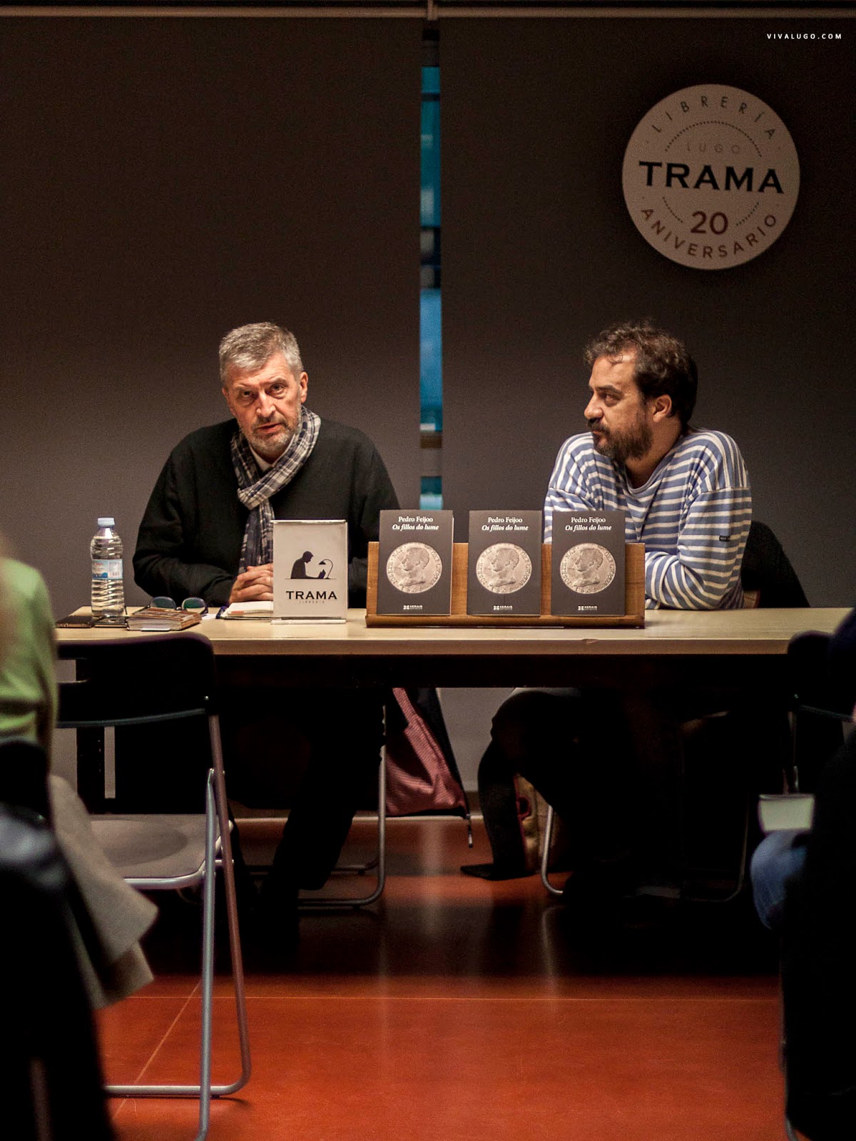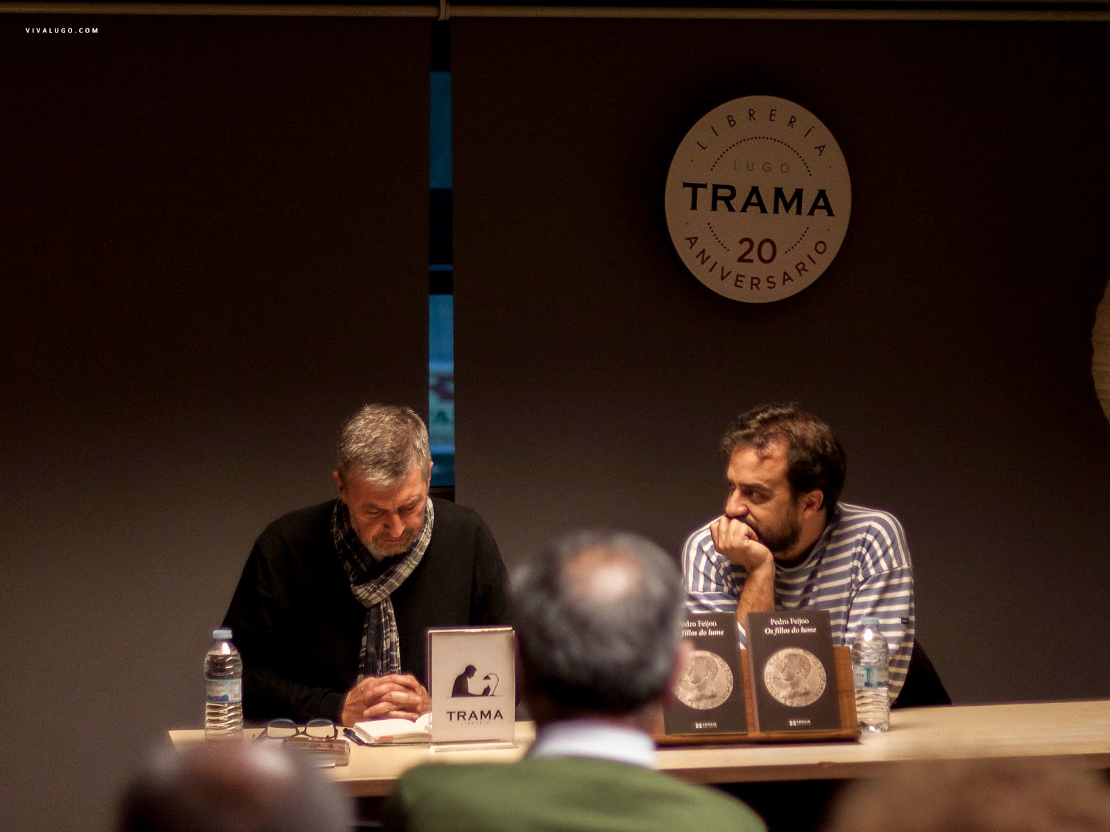 Para rematar a semana de presentacións, o venres 20, estiveron na librería un dos autores galegos de maior éxito, Pedro Feijoo e o seu editor, Manuel Bragado (Xerais) falando do seu último libro «Os fillos do lume» Un libro de intriga, de ficción pero con partes reais xa que ten lugar na Reconquista de Vigo ós franceses.