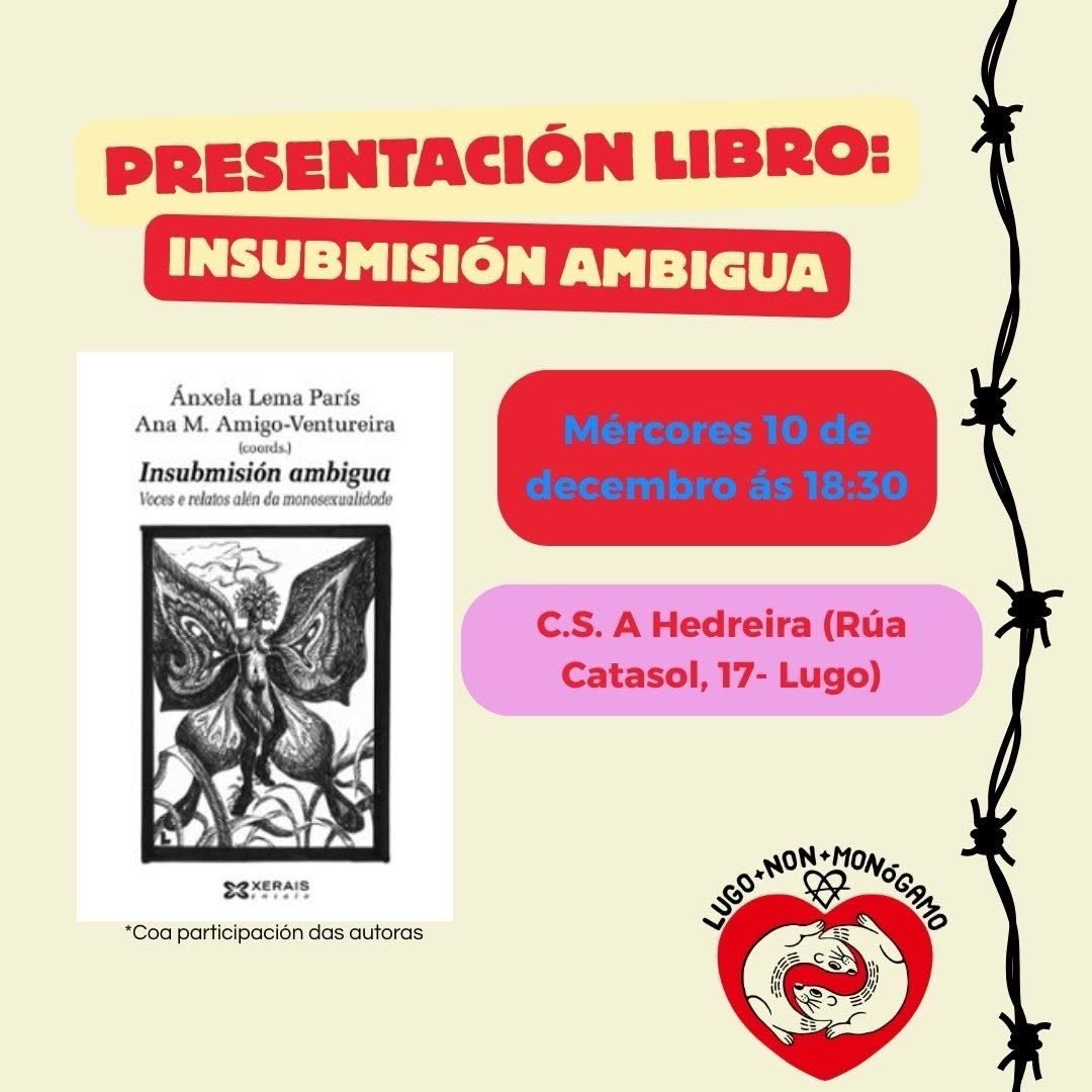 A Hedreira Rua Catasol, 17, LugoPresentación do libro «Insubmisión ambigua» Mércores 10 de decembro de 2025 – 18:30 horas - A Hedreira, centro social. Programa de A Hedreira Lugo – Decembro 2025