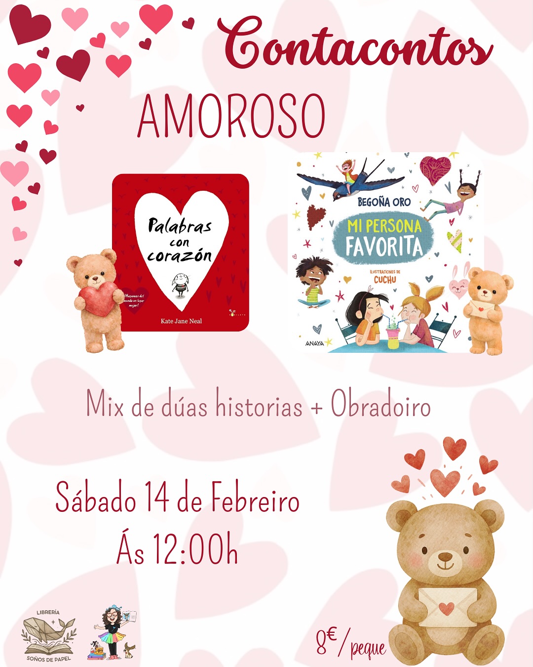 Contacontos amoroso Mix de dúas historias + obradoiro Sábado 14 de febreiro de 2026 12:00 horas Librería Soños de Papel