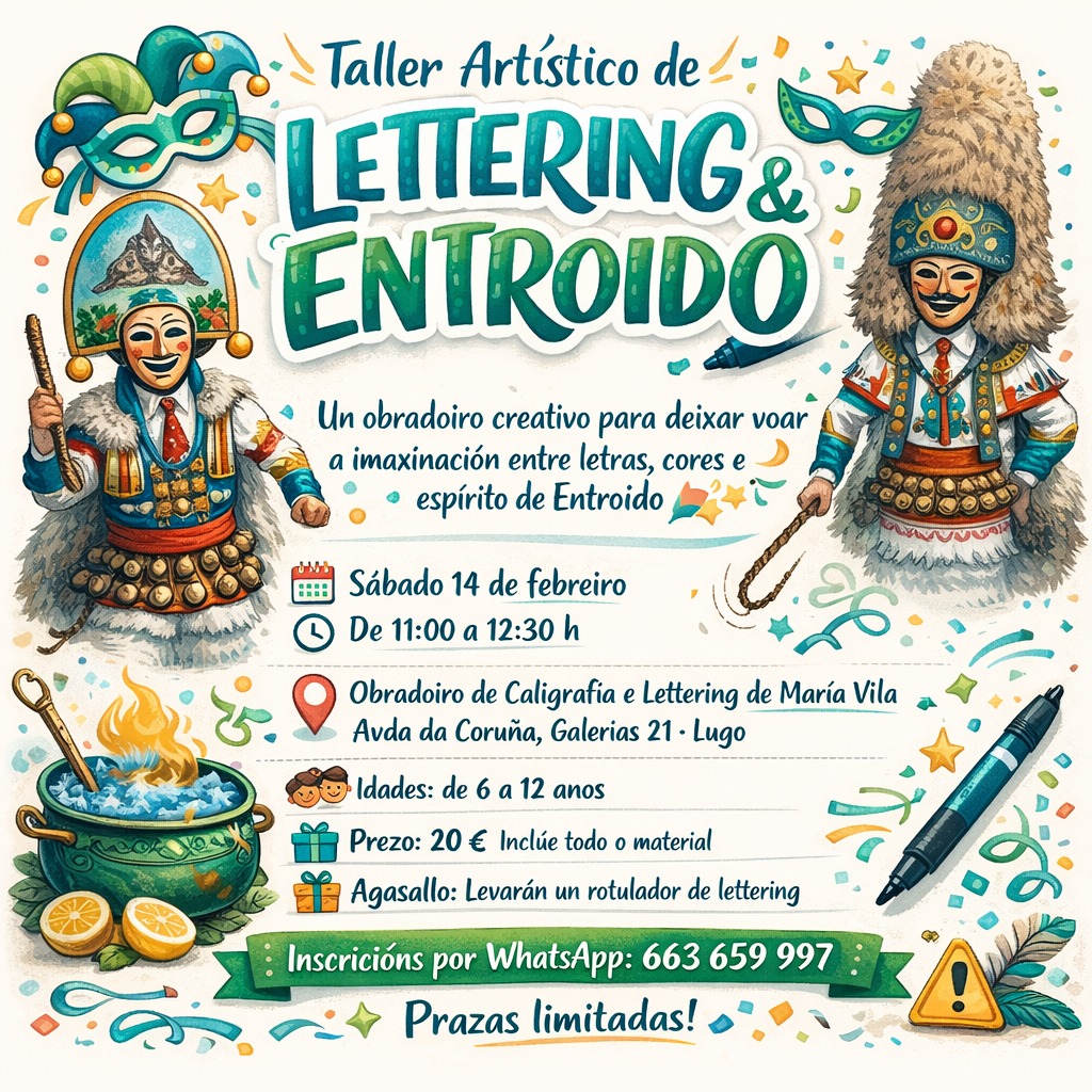 Taller de Lettering e Entroido Sábado 14 de febreiro de 2026 De 11:00 a 12:30 horas Obradoiro de caligrafía de María Vila (Avda da Coruña, galerías 21, Lugo) "Aprenderemos técnicas […]