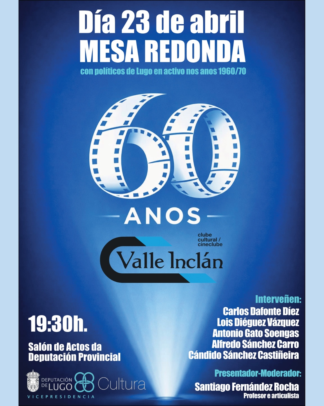 Mesa redonda con políticos de Lugo en activo nos anos 1960/70 23 de abril de 2026 Hora: 19:30 Salón de Actos da Deputación de Lugo Entrada de balde Con: Carlos Dafonte Díaz Lois Diéguez Vázquez Antonio Gato Soengas Alfredo Sánchez Carro Cándido Sánchez Castiñeira Presentador- Moderador/a: Santiago Fernández Rocha Como era a vida e a […]