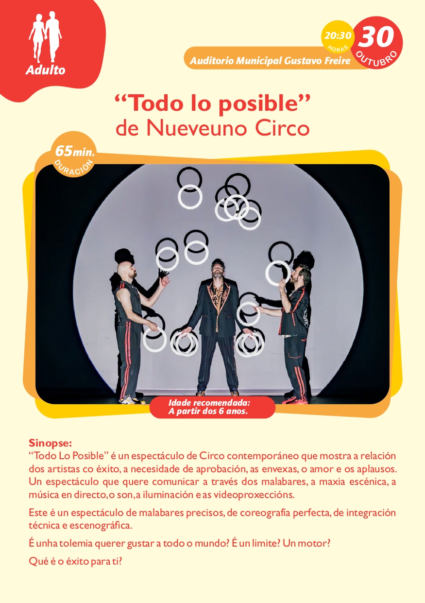 Circo contemporáneo - Todo lo posible Nueveuno Circo Xoves, 30 de outubro de 2025 20:30 hs. Lugar: Auditorio Municipal Gustavo Freire Categoría: Teatro Adultas Idade recomendada: A partir dos 6 anos Sinopse: “Todo […]