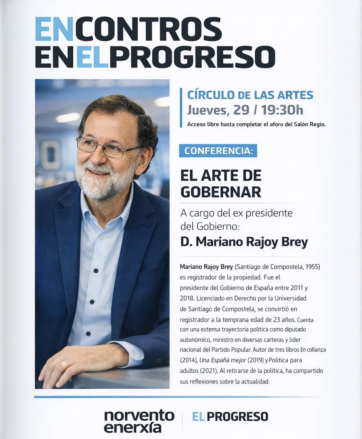 Conferencia de Mariano Rajoy "El arte de gobernar" Jueves 29 de enero de 2026 19:30 horas - Círculo de las Artes de Lugo Acceso libre hasta completar el aforo