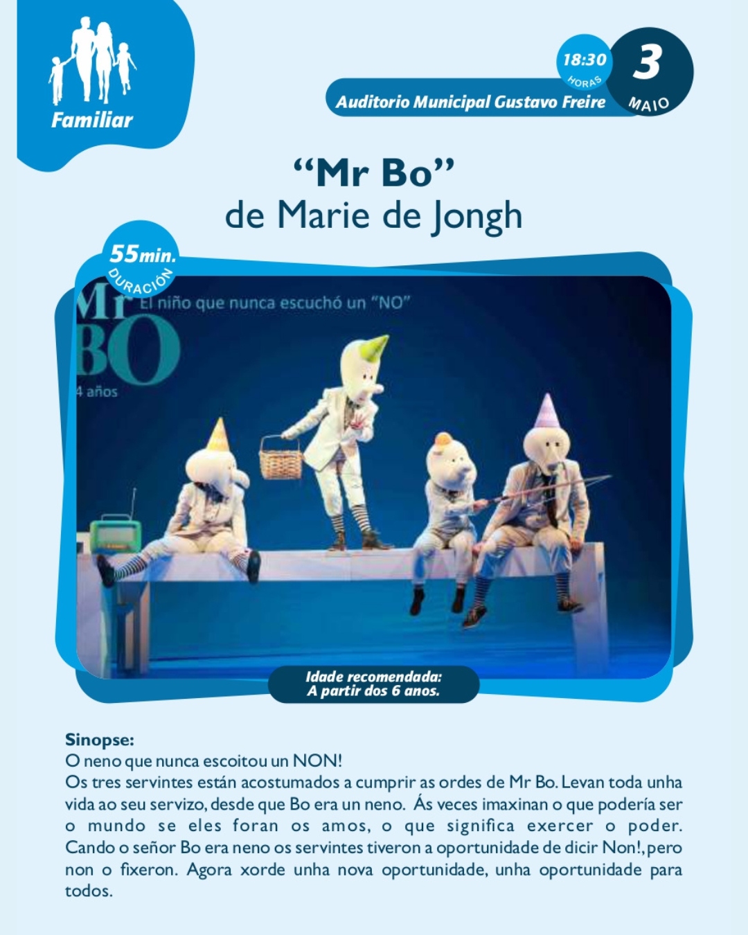 Familiar "Mr Bo" De Marie de Jongh Domingo, 3 de maio de 2026 18:30 hs. Lugar: Auditorio Municipal Gustavo Freire Idade recomendada: A partir dos 4 anos Sinopse: O neno […]