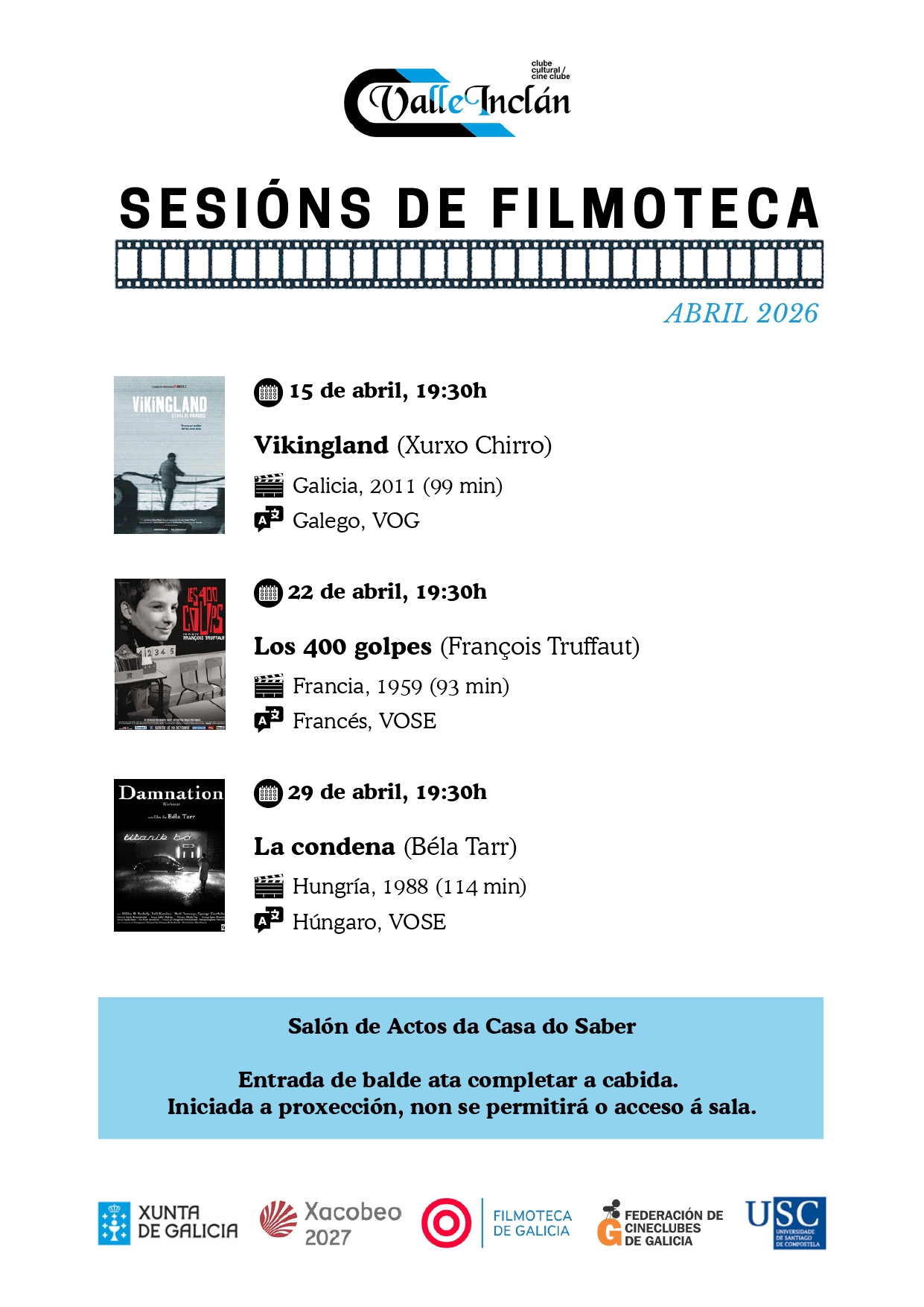 Cine "Los 400 golpes" Ciclo: Sesións de Filmoteca abril 2026 do Club Cultural Valle Inclán Data de proxección: Mér, 22/04/2026 - 19:30 Lugar de proxección: Salón de Actos da Casa […]