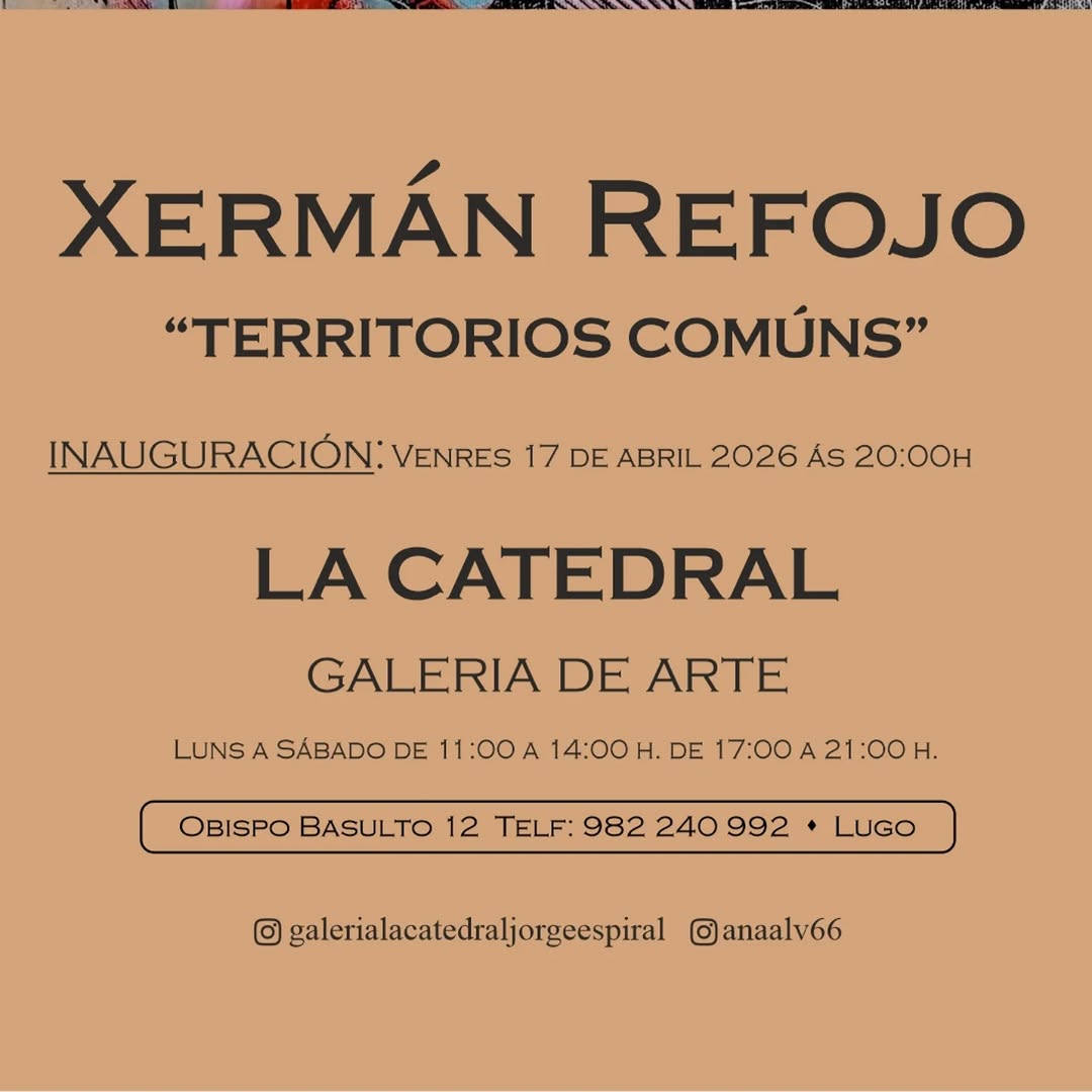 Inauguración da exposición "Territorios Comúns" de Xermán Refojo Venres 17 de abril de 2026 20:00 horas Galería de Arte La Catedral, Obispo Basulto 12 Lugo