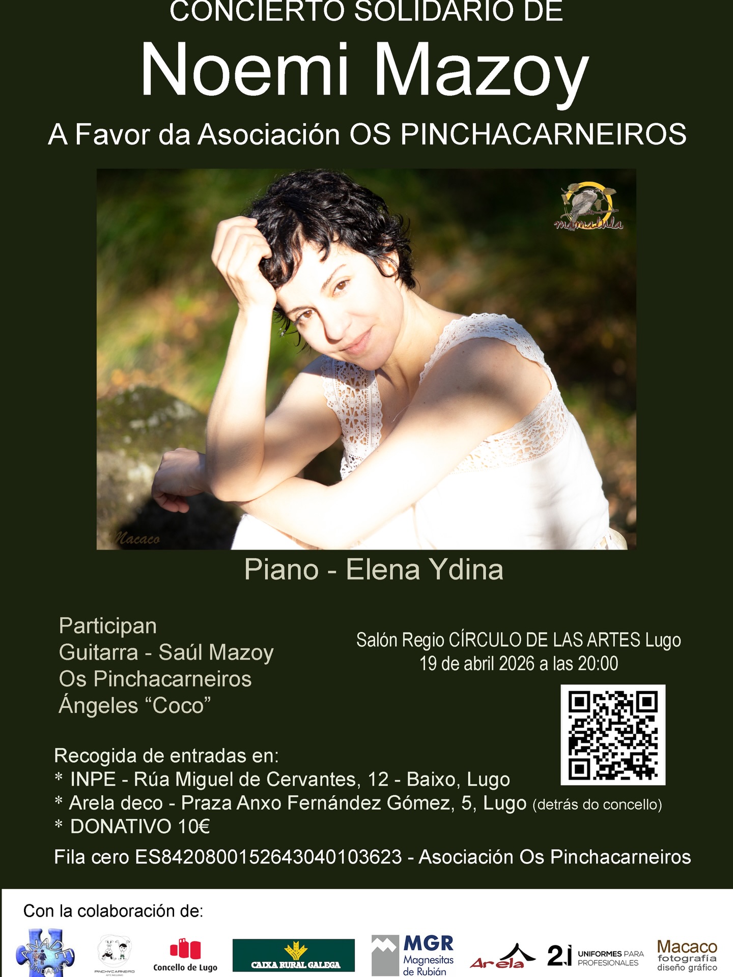 Concierto solidario de Noemi Mazoy a favor de la asociación Os Pinchacarneiros 19 de abril de 2026 20:00 horas Círculo de las Artes de Lugo