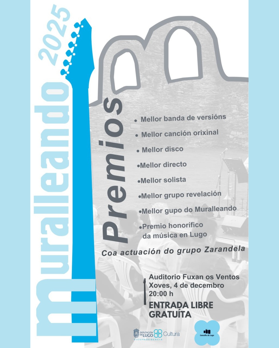 Auditorio Municipal Fuxan os Ventos Rúa Madanela, LUGO, Lugo, SpainPremios Muralleando 2025 - Premios da Música Lucense Xoves 4 de decembro ás 20:00 horas no Auditorio Fuxan os Ventos. Entrada libre e gratuíta. Premios: Mellor Banda de Versións, Mellor […]
