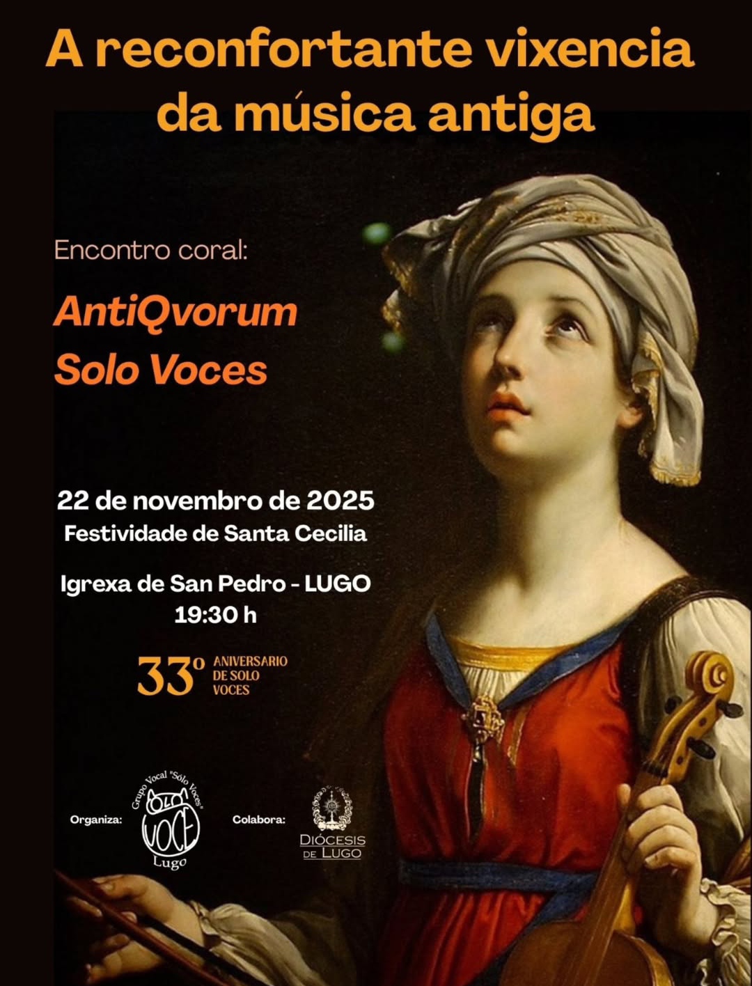 Concerto "A reconfortante vixencia da música antiga" 22 de novembro de 2025 - Igrexa de S. Pedro às 19:30h Festividade de Santa Cecília e 33º Aniversário de Solo Voces Solo Voces e Antiquorum (Ferrol)