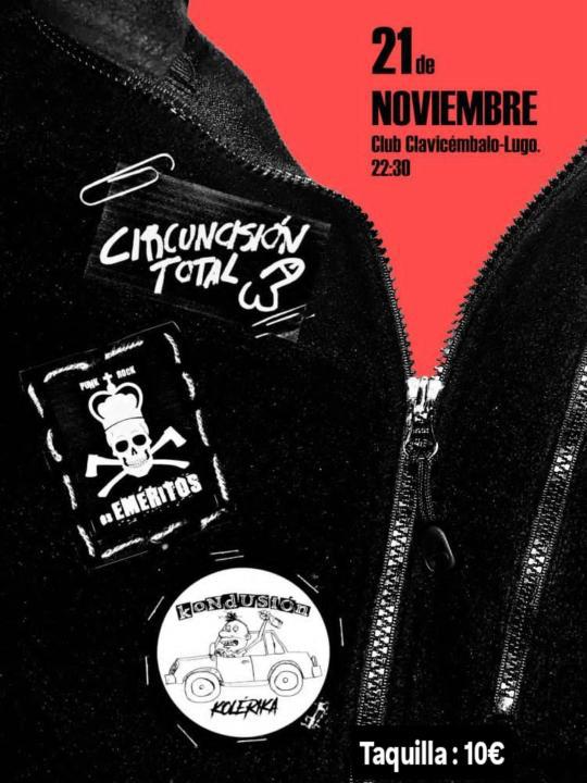 O vindeiro venres 21 apartires das 22:30 na sala Clavicémbalo, tedes unha cita cos; Eméritos (Punk Rock irreverente con crítica Social) xunto con Kondusión Kolérica (Punk Rock enérxico dende a Costa da morte) e Circuncisión Total (Punk Rock duns fimofósicos lucenses).