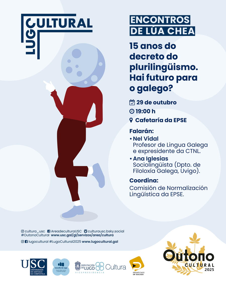 Encontro '15 anos do decreto do plurilinguismo. Hai futuro para o galego? 29.10.2025 | 19.00h Escola Politécnica Superior de Enxeñaría Lugo Cafetaría Neste 2025, o Consello da Cultura Galega publicou un documento de traballo sobre as competencias e usos das linguas cooficiais en España, que veu corroborar a caída do uso do galego entre as xeracións […]