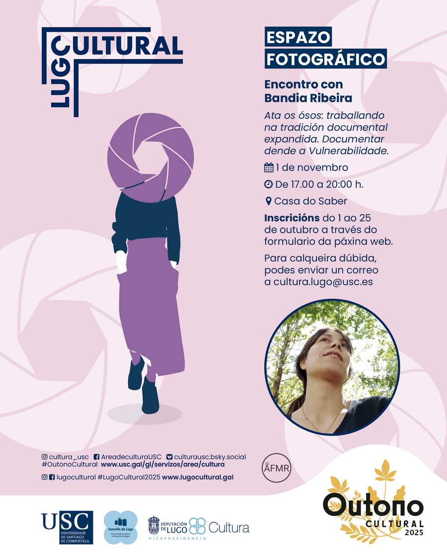 Encontro fotográfico con Bandia Ribeira Data: 1 de novembro de 2025 Lugar: Casa do Saber Horario: 17:00 a 20:00 Ata os ósos: traballando na tradición documental expandida. Documentar dende a vulnerabilidade' “No meu traballo sempre me pregunto canto máis intimamemente podo conectar con un suxeito e un lugar a través da cámara. É un motor […]