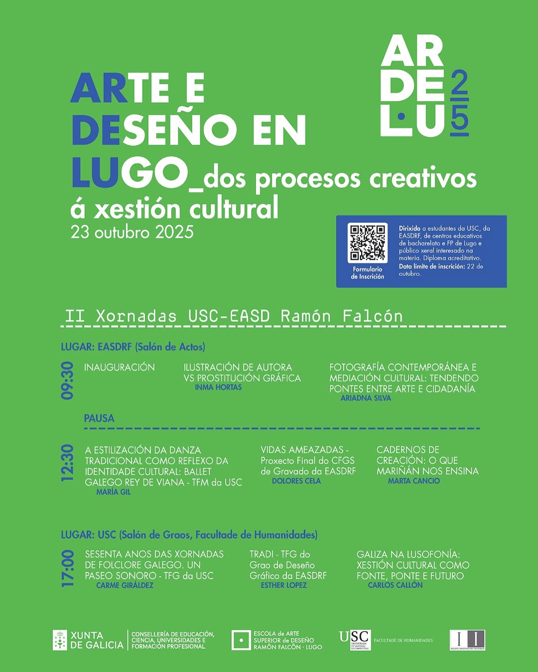 O xoves 23 de outubro terá lugar a II Xornada USC-EASDRF, no marco do convenio de colaboración entre a @facultade_humanidades da USC e a Escola de Arte e Superior de Deseño Ramón Falcón. O evento da continuidade ás xornadas que levan por título 𝐀𝐫𝐭𝐞 𝐞 𝐃𝐞𝐬𝐞𝐧̃𝐨 𝐞𝐧 𝐋𝐮𝐠𝐨. 𝐃𝐨𝐬 𝐩𝐫𝐨𝐜𝐞𝐬𝐨𝐬 𝐜𝐫𝐞𝐚𝐭𝐢𝐯𝐨𝐬 𝐚́ 𝐱𝐞𝐬𝐭𝐢𝐨́𝐧 𝐜𝐮𝐥𝐭𝐮𝐫𝐚𝐥, e que iniciaran […]