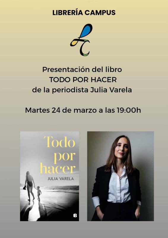 El martes 24 de marzo a las 19:00 en librería Campus de Lugo Julia Varela presenta su libro 'Todo por hacer'. Julia Varela, nos deslumbra en esta novela con su sensibilidad y belleza narrativa. “Todo por hacer” nos habla de la vida, la pérdida y el amor. Un relato precioso que explora las relaciones entre […]