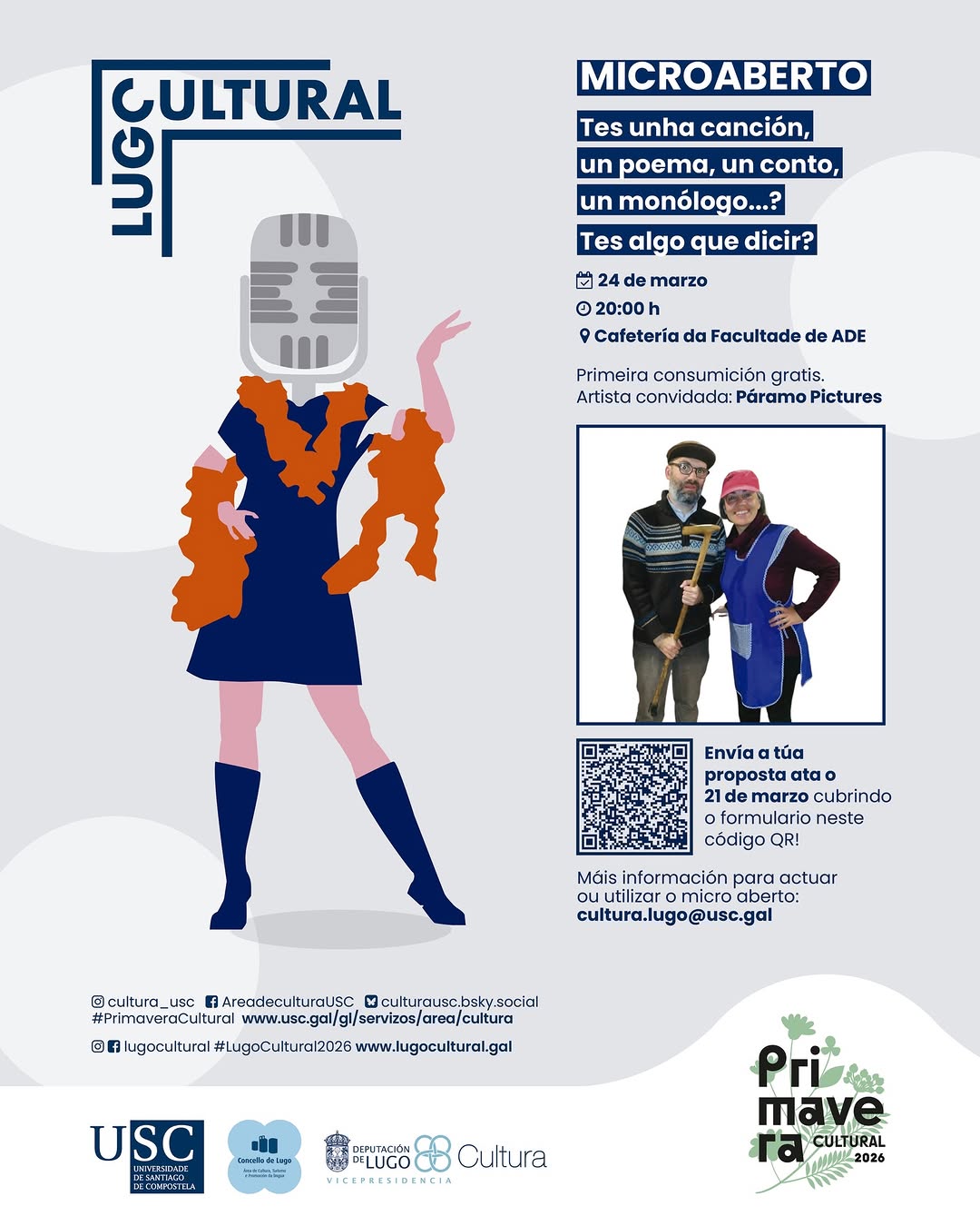 Para participar no microaberto cunha canción, un monólogo, un poema, un conto etc, tes que seguir as instrucións que aparecen nesta ligazón entre o 2 e o 21 de marzo. Para ter máis información para actuar ou utilizar o micro aberto, escribe a cultura.lugo@usc.gal.