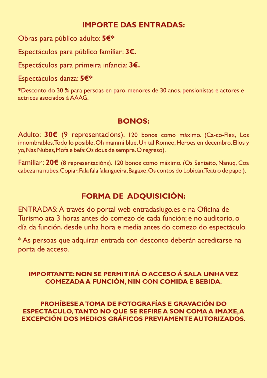 Adquisición de entradas a través do portal web entradaslugo.es e na Oficina de Turismo ata 3 horas antes do comezo de cada función; e no auditorio, o día da función, desde unha hora e media antes do comezo do espectáculo.