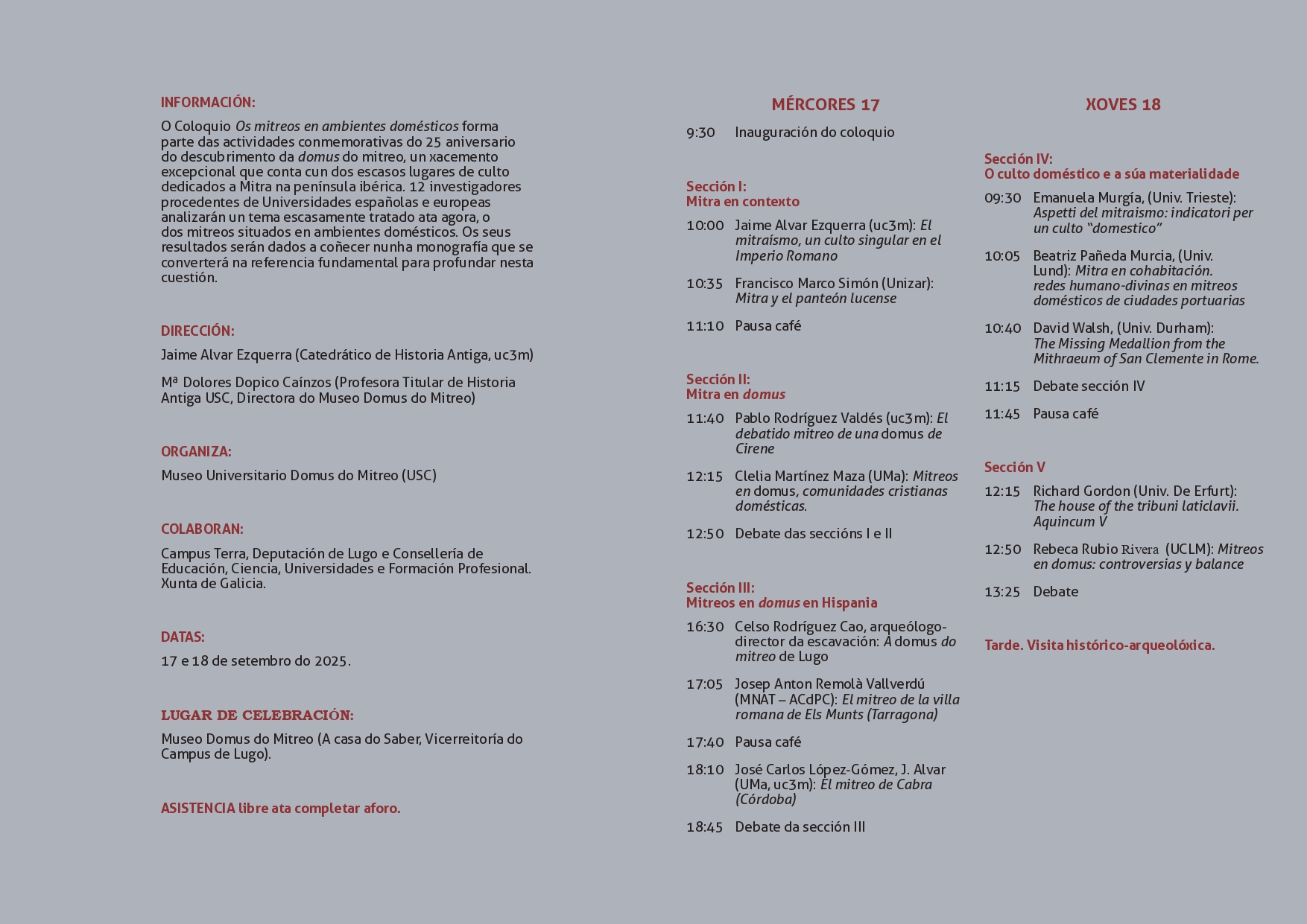 O coloquio comezará situando a Mitra no seu contexto para, a continuación, abordar de xeito específico a Mitra na domus. Os mitreos en domus en Hispania, así como o culto doméstico e a súa materialidade integran tamén o programa que se estende ao longo de dúas xornadas.