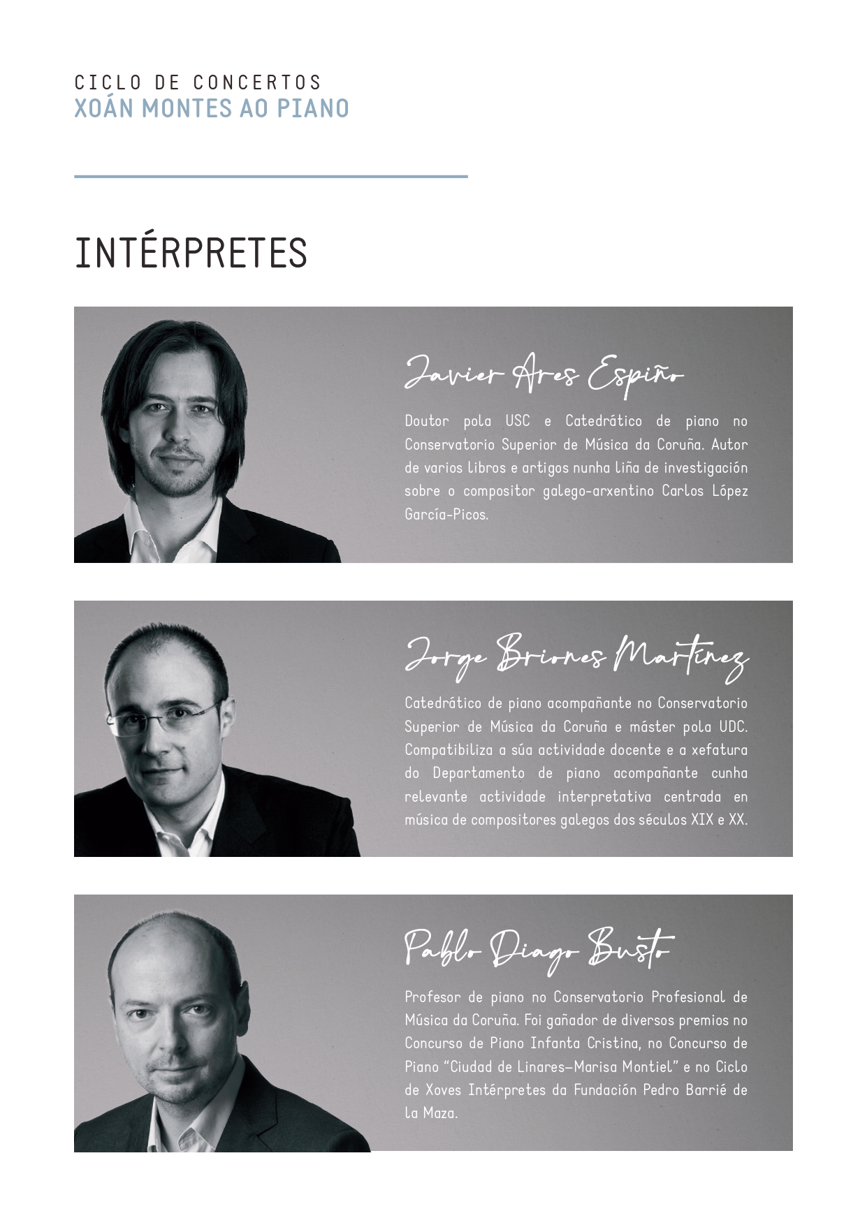 Javier Ares Espiño, Jorge Briones Martínez e Pablo Diago Busto darán un recital ao piano dentro da programación do Outono Cultural, concerto incluído dentro do Ciclo ‘Xoán Montes ao piano’.