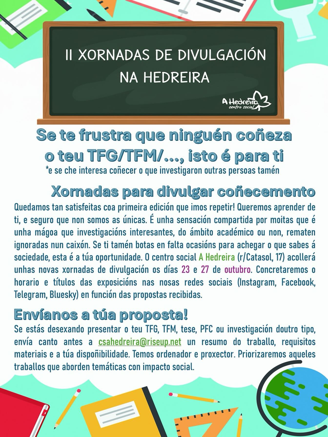 Se estás desexando presentar o teu TFG, TFM, tese, PFC ou investigación doutro tipo, envía canto antes a csahedreira@riseup.net un resumo do traballo, requisitos materiais e a túa dispoñibilidade. Temos ordenador e proxector. Priorizaremos aqueles traballos que aborden temáticas con impacto social