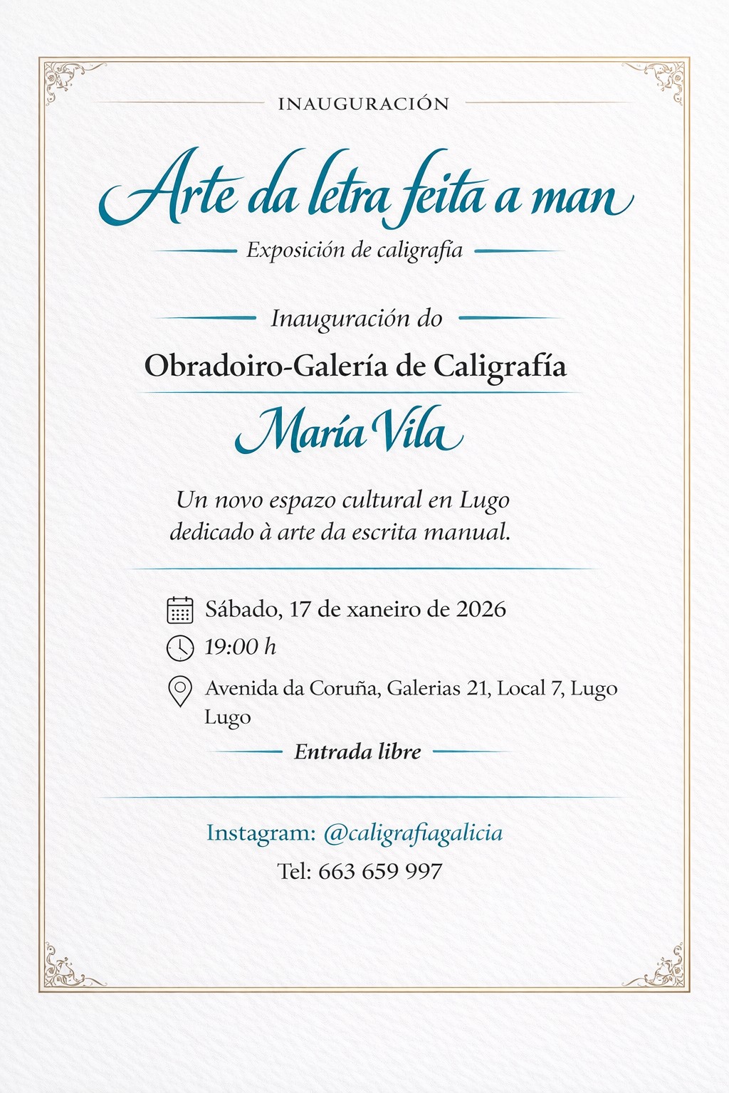 Sábado 17 de xaneiro de 2026, ás 19:00 h, na Avenida da Coruña, Galerías 21, Local 7, Lugo: «Obradoiro-Galería de Caligrafía»