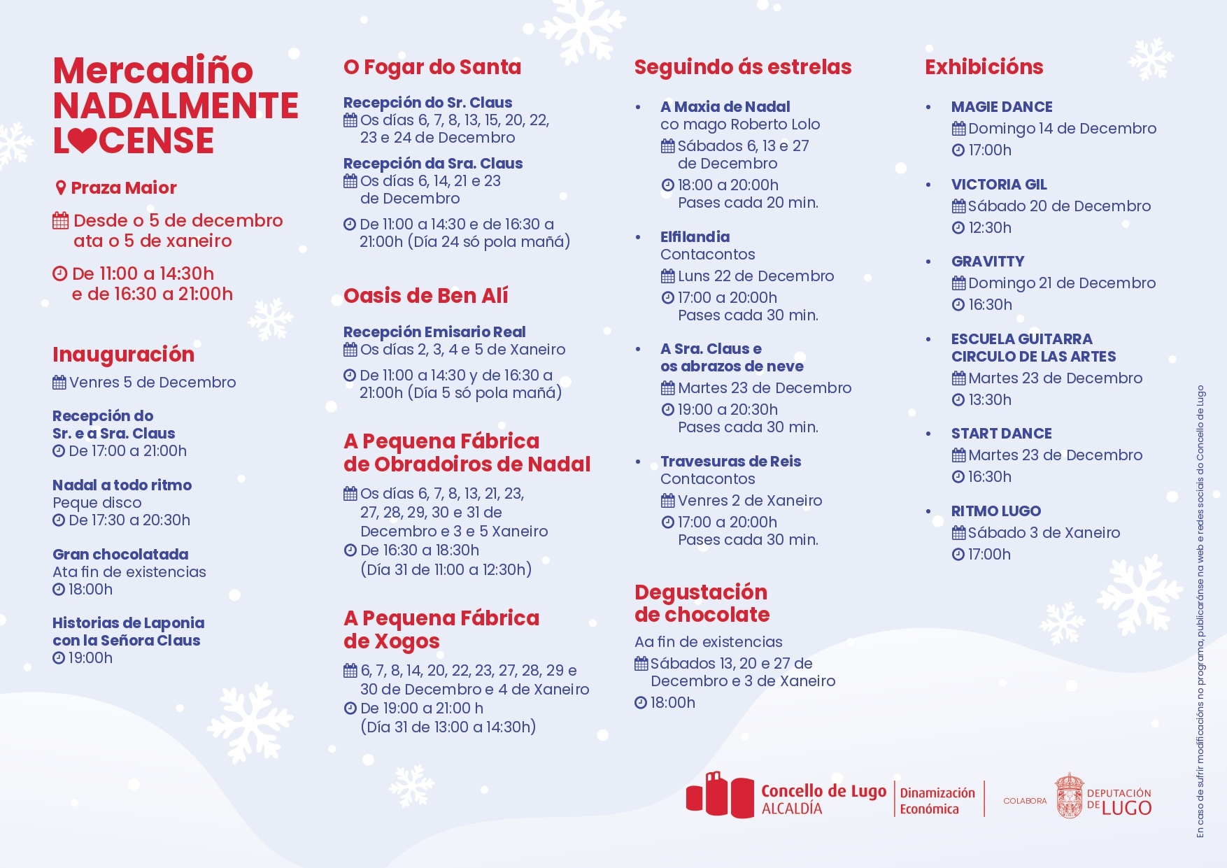 Na Praza Maior de Lugo entre o 5 de decembro e o 5 de xaneiro. O mercado, que funcionará en horario de mañá e tarde -agás os días 24 e 31, cando abrirá só pola mañá, e os días 25 e 1, que permanecerá pechado- contará cunha ampla programación de actividades: