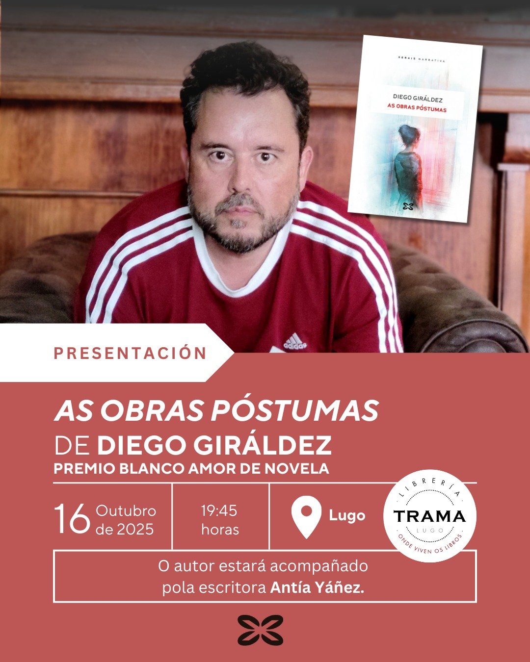 A libraría Trama de Lugo será o escenario este xoves 16/10 da primeira presentación na cidade de «As obras póstumas», a nova novela de Diego Giráldez publicada pola Editorial Xerais e gañadora do XLIII Premio Blanco Amor de novela.
