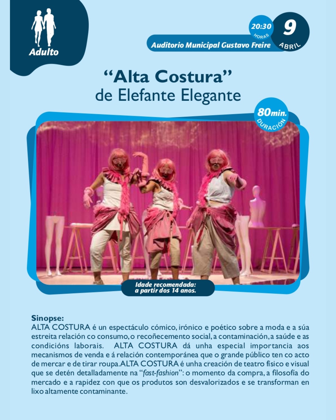 ALTA COSTURA é un espectáculo cómico, irónico e poético sobre a moda e a súa estreita relación co consumo, o recoñecemento social, a contaminación, a saúde e as condicións laborais.