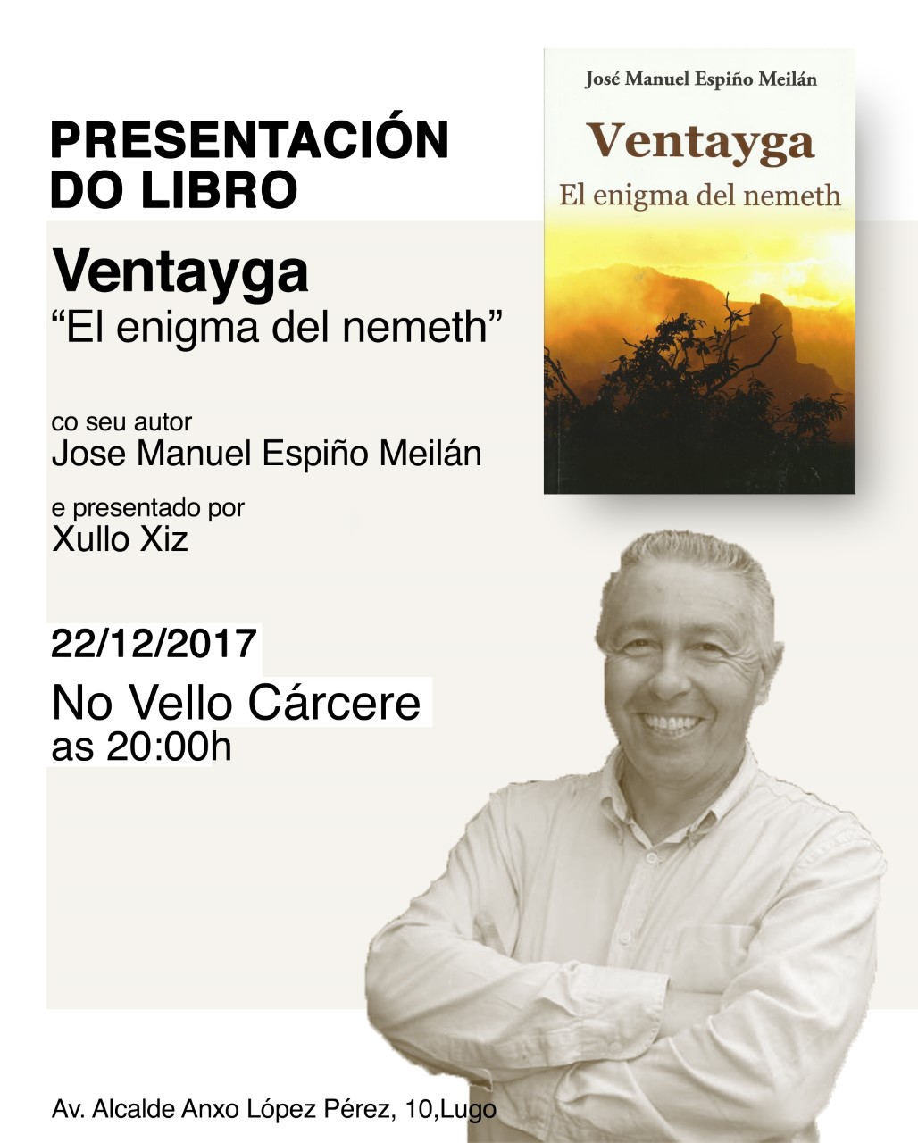 DIC 2017 El escritor lucense José Manuel Espiño Meilán presentará el próximo día 22 de diciembre , a las 20.00 horas, en la Vieja Cárcel, su última novela: «Ventayga, el enigma del nemeth«.