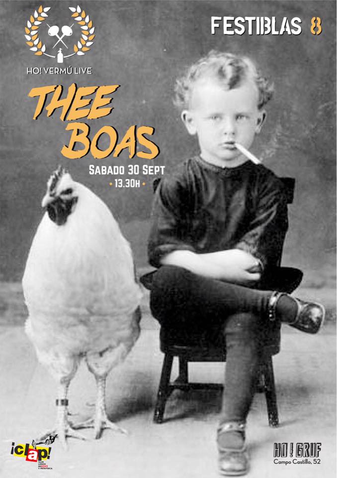 Desde Compostela, soando como unha sorte de garaxe punk ruidista, cheos de feedbacks e psicodelia, concertos con riffs incendiarios, baixos e baterías que pisan cal mamuts, slides delirantes e letras que falan de compromisos, amor, desamor, inquietude, ambición … Son THEE BOAS e poderémolos gozar tamén ao mediodía na sesión vermut do Ho Gruf en versión mais acústica onde tocarán temas vellos e algunha que outra sorpresa que non interpretaron antes polo menos xuntos. Bandcamp: Thee Boas
