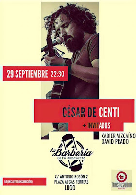 El concierto de César De Centi + artistas invitados se celebrará el viernes, 29 de septiembre a las 22:30 Además del lujo de contar con Xabier Vizcaíno y David Prado como artistas invitados, César de Centi nos da algunas razones en su Facebook para ir: