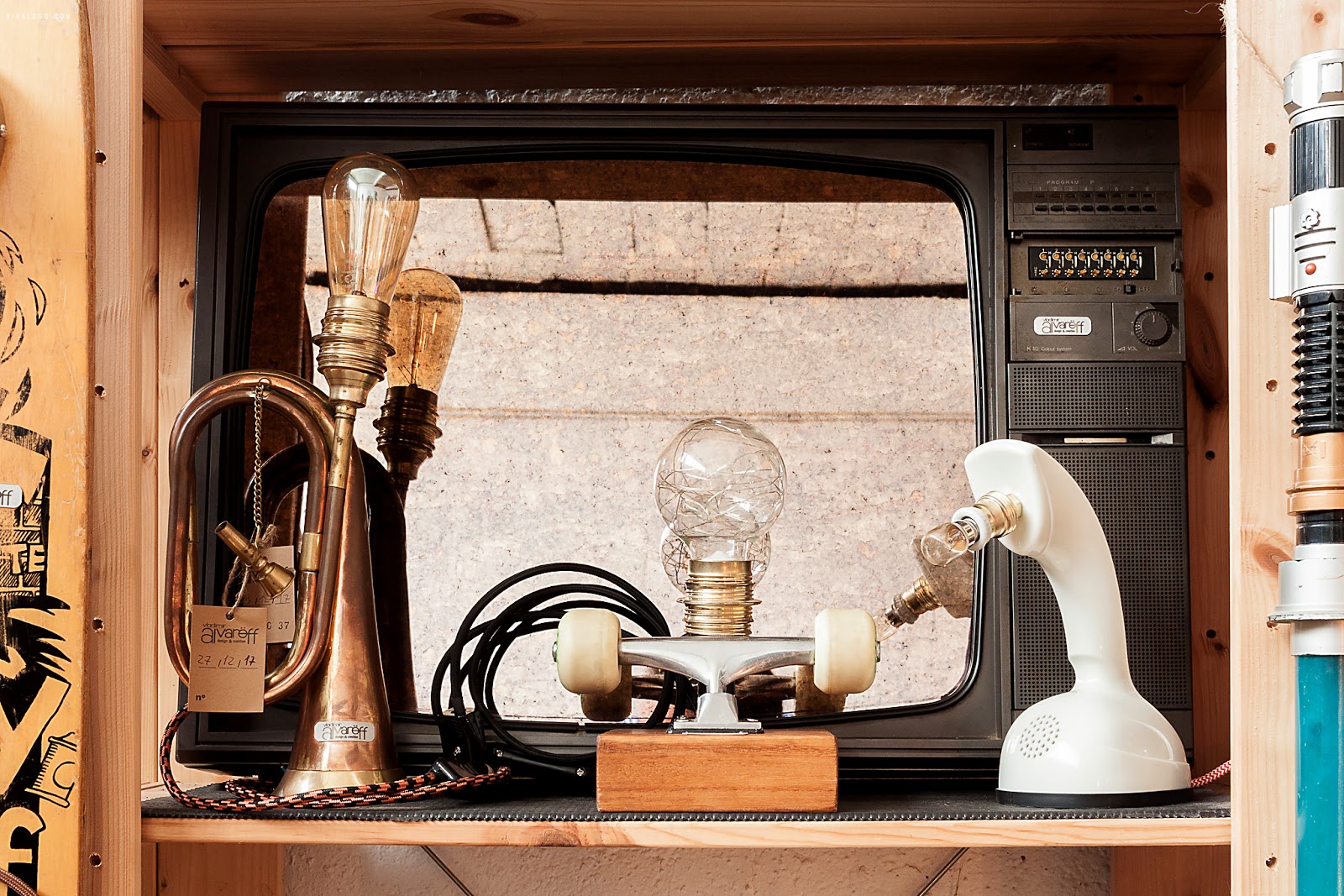 Si quieres ver y/o comprar una lámpara o hacerle un encargo (tu le llevas el objeto y él lo convierte en lámpara), visita su Facebook y ponte en contacto con Alvaro, a.k.a. Vladimir Alvaröff.