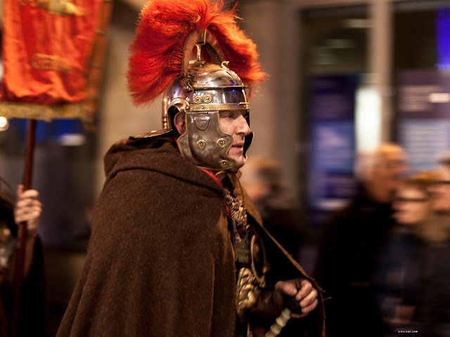 Recreación do inicio da construción da Muralla de Lugo, Moenia Lucensis Civitatis, dentro dos actos do XVII Aniversario da declaración deste monumento como Patrimonio da Humanidade, organizados polo Concello. Praza Maior, diante da Casa do Concello