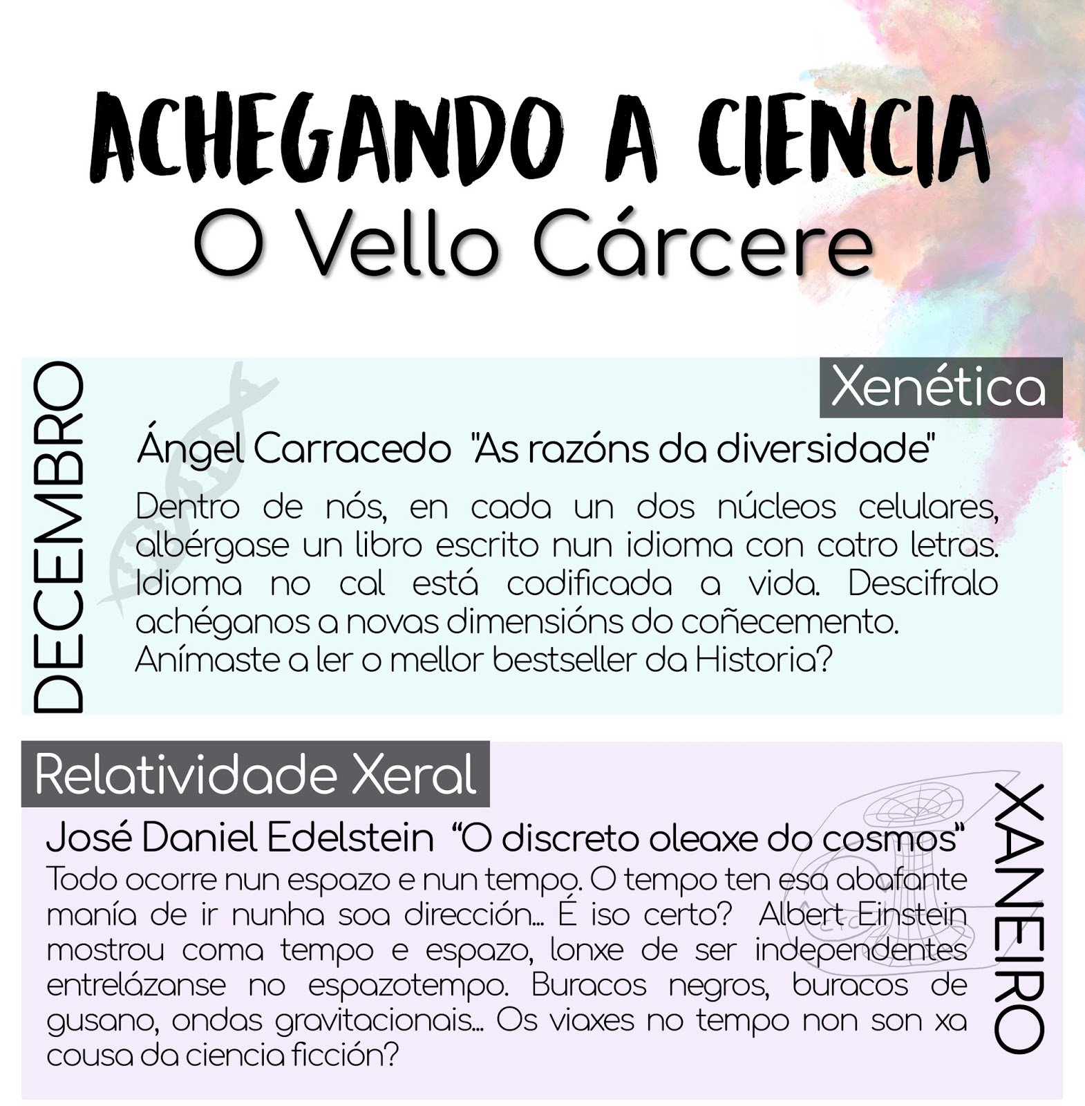 A primeira das conferencias é este xoves, 14 de decembro, a partir das 20:30 horas no Salón de Actos do Vello Cárcere. Baixo o título de As razóns da diversidade falarase sobre a xenética e as súas aplicacións tales como a loita contra as enfermidades. Será a cargo do catedrático de mediciña Ángel Carracedo.