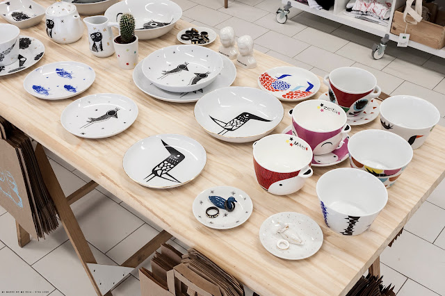 También realizan piezas únicas y/o piezas personalizadas (un dibujo tuyo, nombre …) en cualquiera de los materiales que trabajan: papel, textil, porcelana…