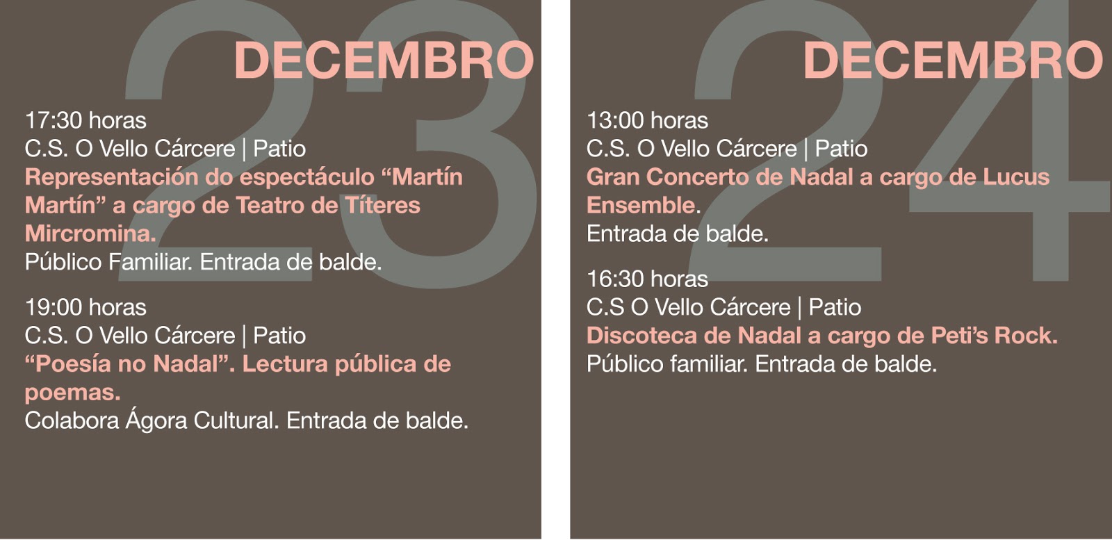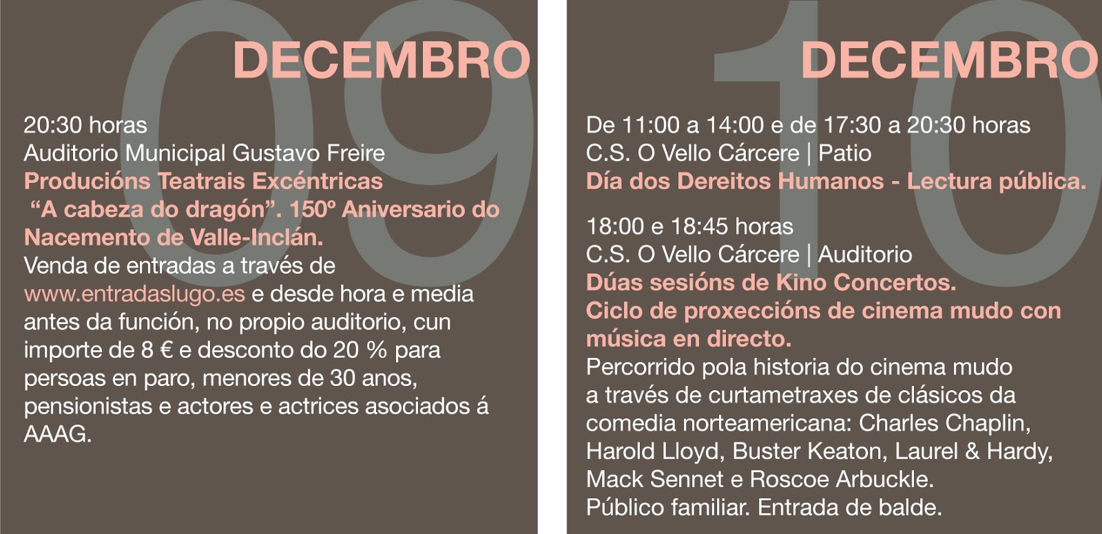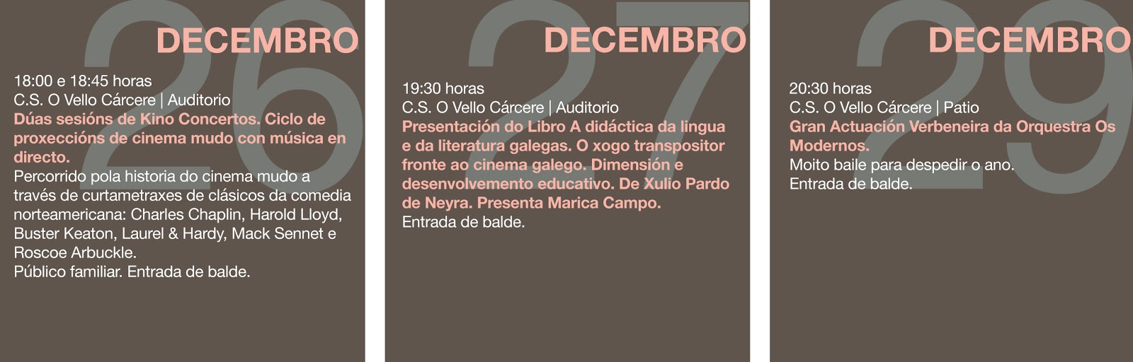 A programación completa, que ven de presentar a Concelleira de Cultura, Turismo, Xuventude e Promoción da Lingua, Carmen Basadre, este venres 1/12, é a seguinte. Se clicades nas imaxes as veredes máis grandes.