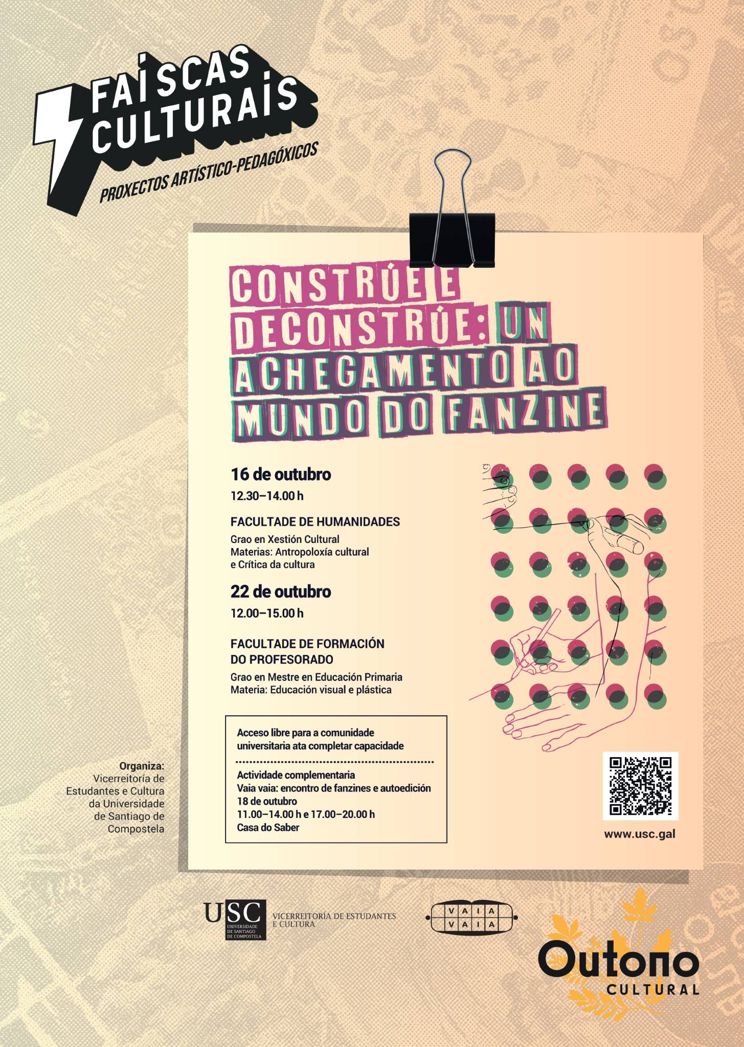 O programa de faísca cultural ‘Constrúe e deconstrúe: un achegamento ao mundo do fanzine’ xirará arredor do ‘Encontro de fanzines e autoedición’ de Vaia Vaia que terá lugar o 18 de outubro na Casa do Saber do campus de Lugo, en horario de 11.00 a 14.00 e de 17.00 a 20.00 horas.