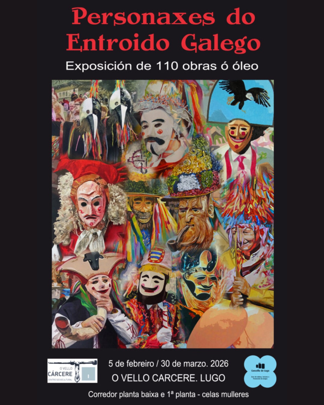 Apertura ao público da exposición “Personaxes do Entroido Galego” de C. Padín no Vello Cárcere. A mostra poderá visitarse ata o 30 de marzo, e conta con máis de 100 obras que amosa as personaxes máis características do entroido galego.
