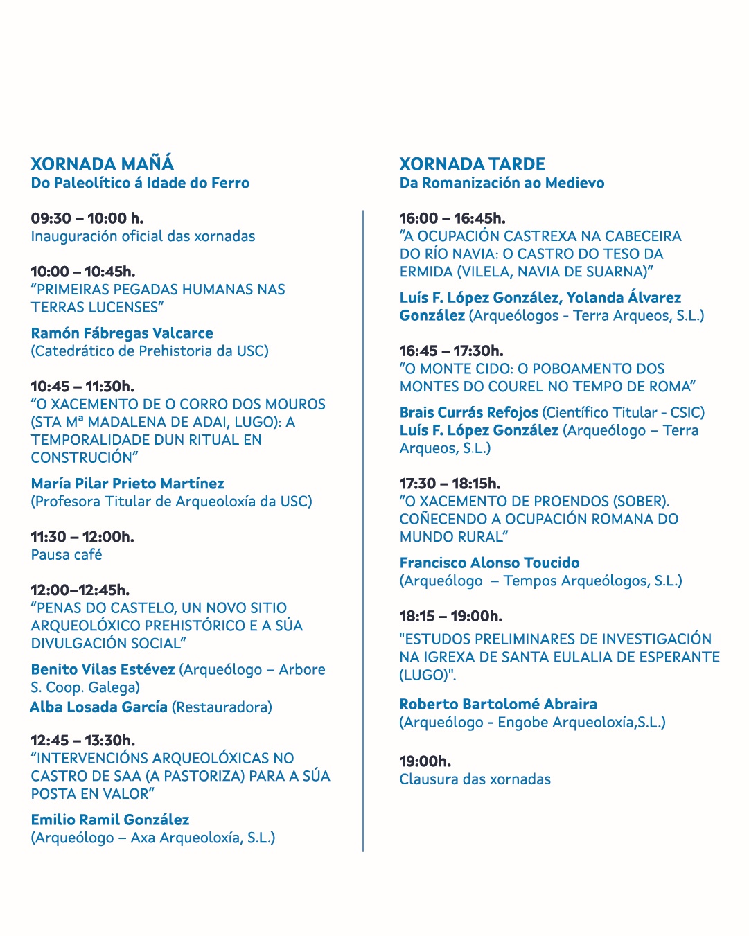 Abrirán o programa as conferencias do catedrático de Prehistoria Ramón Fábregas (ás 10,00 horas) e a profesora de Arqueoloxía María Pilar Prieto (10,45 h.), ambos da Universidade de Santiago de Compostela, que falarán respectivamente sobre as primeiras pegadas humanas nas terras lucenses e o Corro dos Mouros de Adai, no municipio de Lugo.